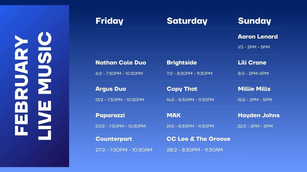 Experience Newcastle’s vibrant music scene with performances from local artists every Friday / Saturday night and Sunday afternoon on The Green. Check out the live music schedule below.
